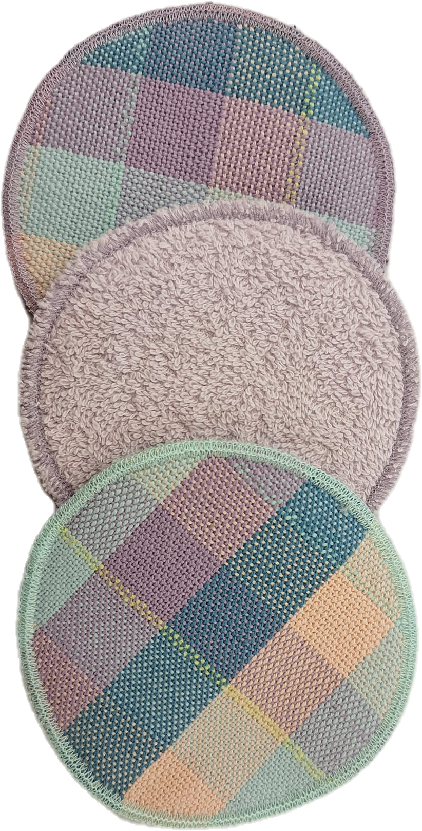 Die Abschmink- & Peelingpads bestehen zum einen aus einer handgewobenen, rauen Seite für das Peeling sowie einer Seite aus Frotté zum Abschminken. Für die Frottéeinsätze verwenden wir Restabschnitte, die bei der Produktion unserer Kinder-Bademäntelis anfallen. Die ressourcen-schonenden Pads können mit bis zu 40°C gewaschen und somit immer wieder verwendet werden.