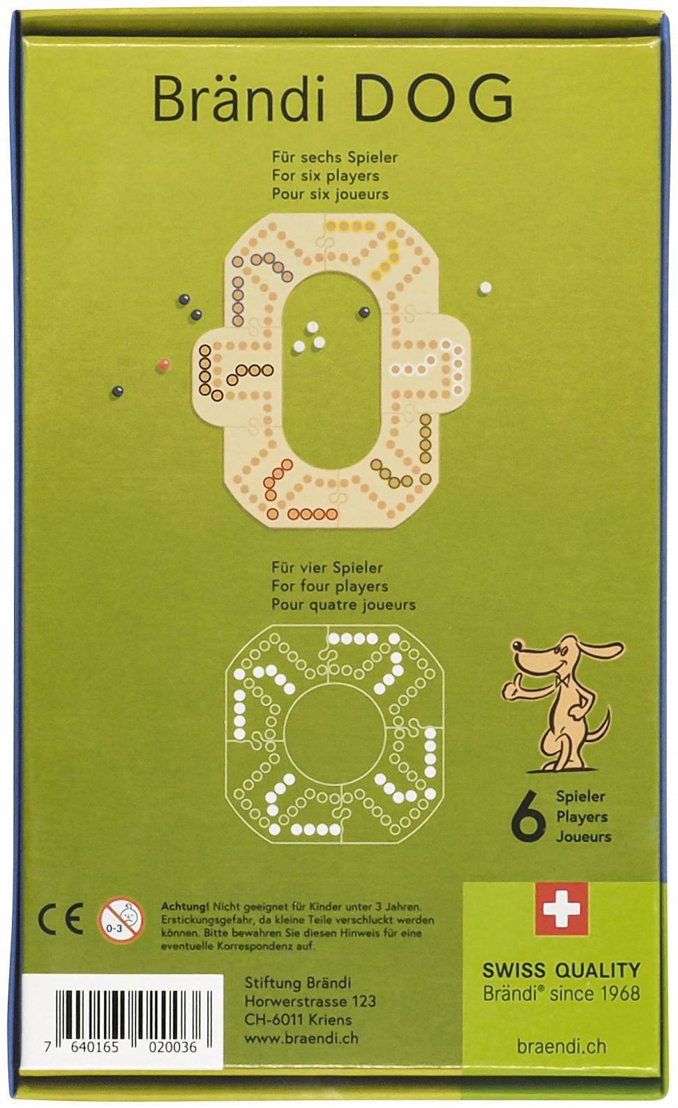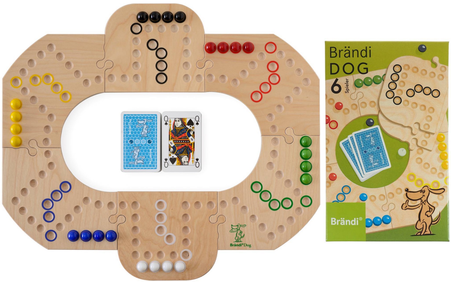 Brändi Dog ist ein Teamspiel. Die eigenen Murmeln müssen vom Zwinger ins Ziel gebracht werden. Gespielt wird mit Karten. Die Reihenfolge der gespielten Karten verbindet Taktik, Strategie und Glück. Das Team, welches zuerst alle Murmeln im Ziel hat, gewinnt.