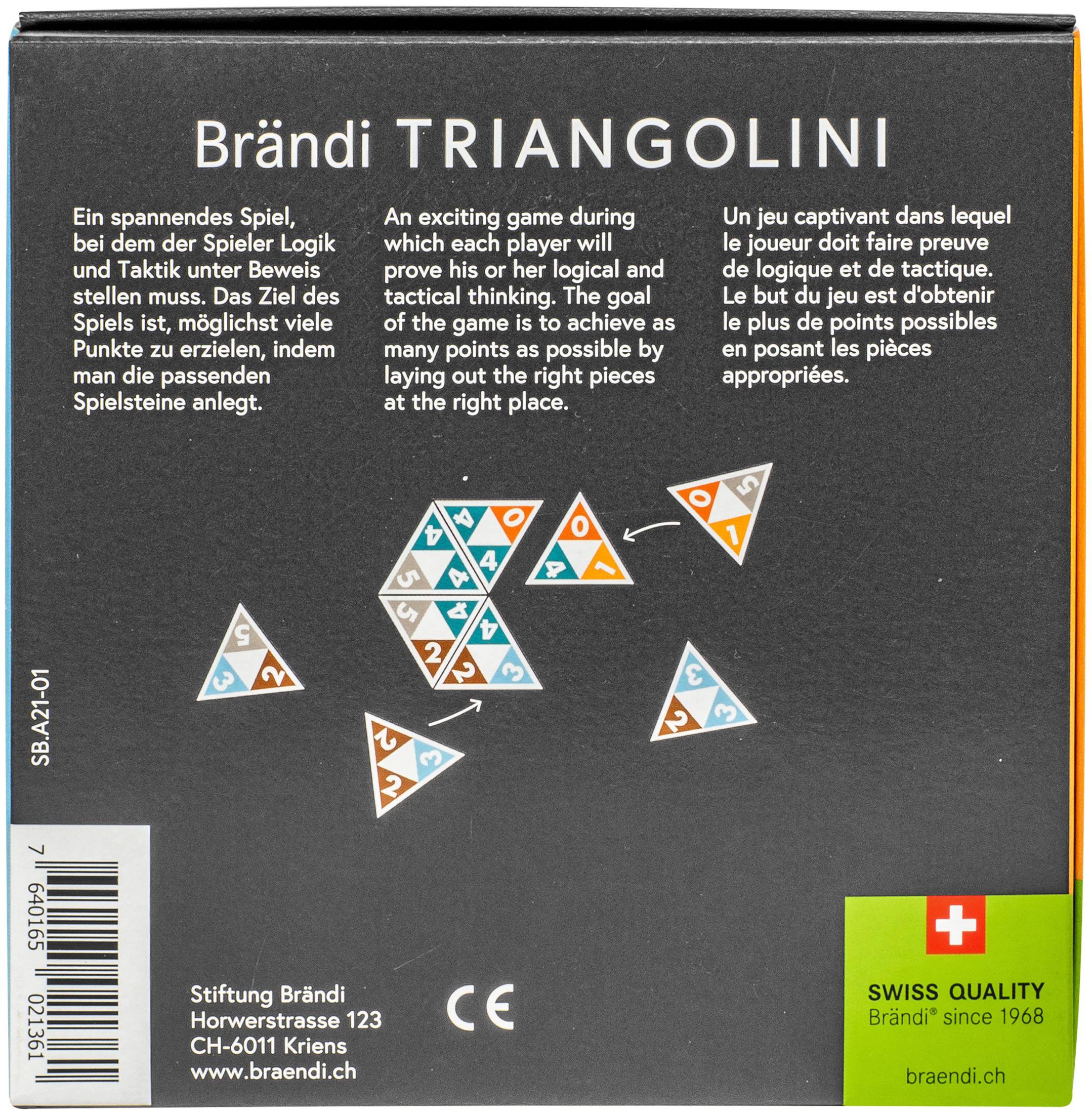 Das Brändi Triangolini ist ein Legespiel aus Holz. Ziel des Spiels ist es, möglichst viele Punkte zu erreichen, indem man die passenden Spielsteine anlegt. Die Punkte basieren auf den Zahlen der gespielten Steine sowie auf speziellen Platzierungen der Steine. Sieger ist der Spieler, der am meisten Punkte sammeln konnte