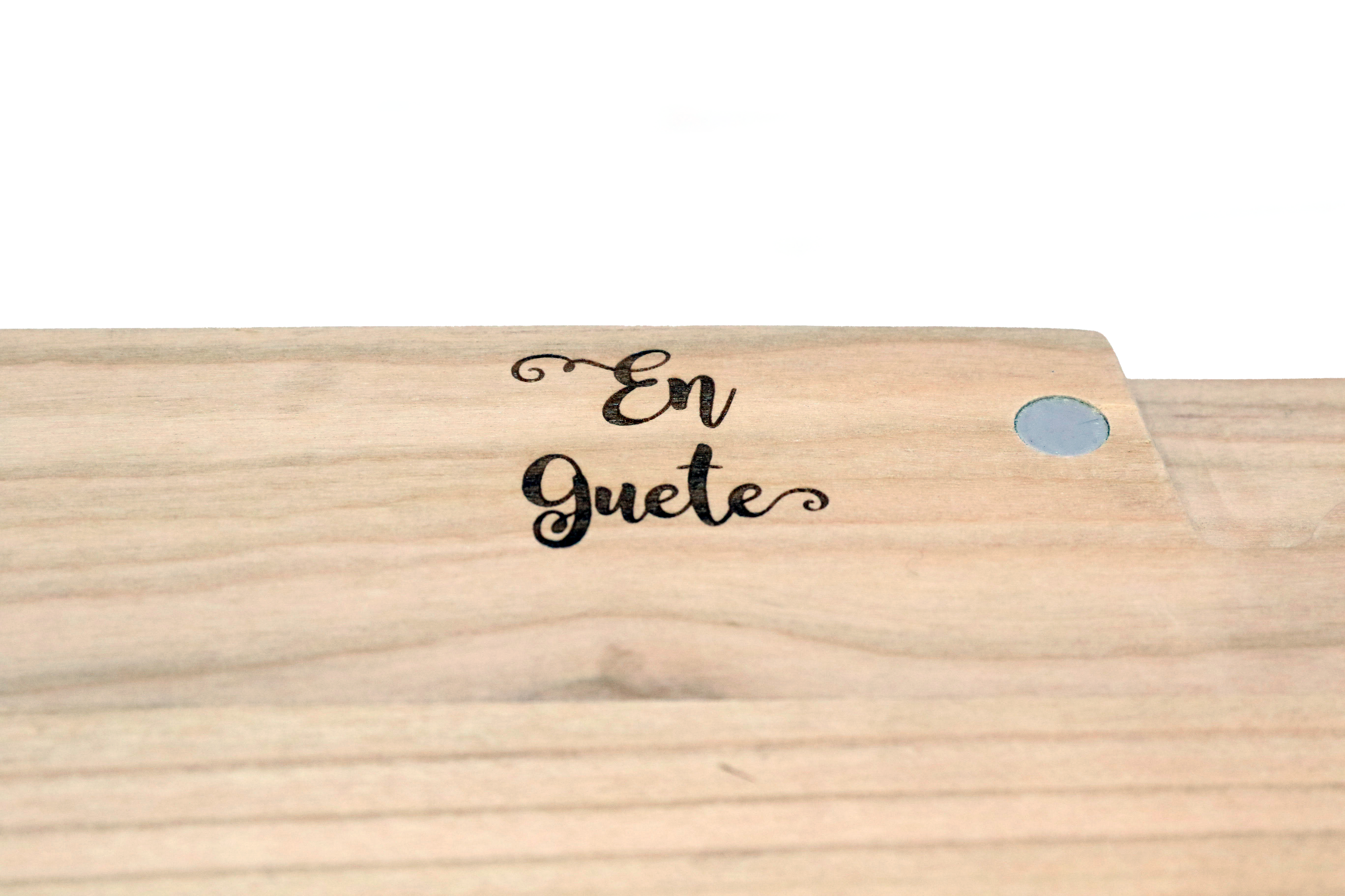 Schneidebrett aus Kirschholz mit schönem Laserdruck "En Guete" inklusive eingestecktem Santoku-Küchenmesser von Victorinox