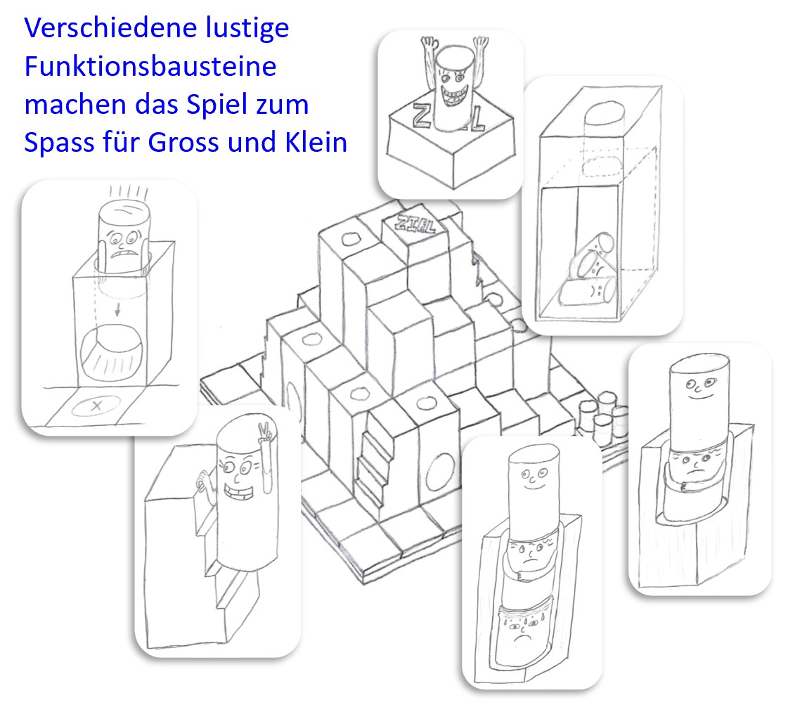 Verschiedene lustige Funktionsbausteine machen das Spiel zum Spass für Gross und Klein. Treppen, Rutschen und Fallen machen das Spiel unberechenbar. Du beginnst mit der ersten deiner vier Spielfiguren. Wenn diese in eine Falle oder ins Verliess fällt, ist sie verloren und du stellst eine neue Spielfigur aufs Startfeld. Wenn du das nächste Mal an der Reihe bist, kannst du von dort wieder starten. Hast du alle vier Spielfiguren versenkt, hast du verloren und bist raus. Die anderen spielen weiter. Es kann auch sein, dass keiner der Spielenden eine Spielfigur ganz nach oben bringt. Dann hat gewonnen, wer als letztes noch im Spiel ist. Dies passiert umso eher, je mehr Funktionsbausteine verbaut sind. Es gewinnt, wer als erstes eine Spielfigur auf den Zielbaustein bringt.