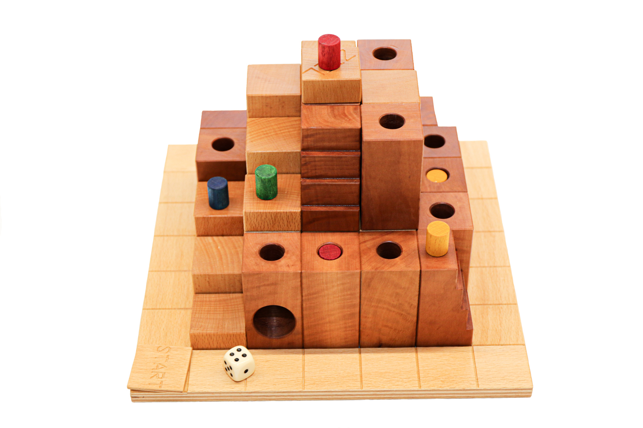 Die mitgelieferten Bausteine in der Basisvariante des Spiels reichen aus um eine zweistöckige Pyramide zu bauen, ähnlich wie in den Bildern gezeigt. Die erste Etage hat 5x5=25 Bausteine, die zweite Etage 3x3=9 Bausteine. Ganz oben sitzt dann der Baustein «Ziel».