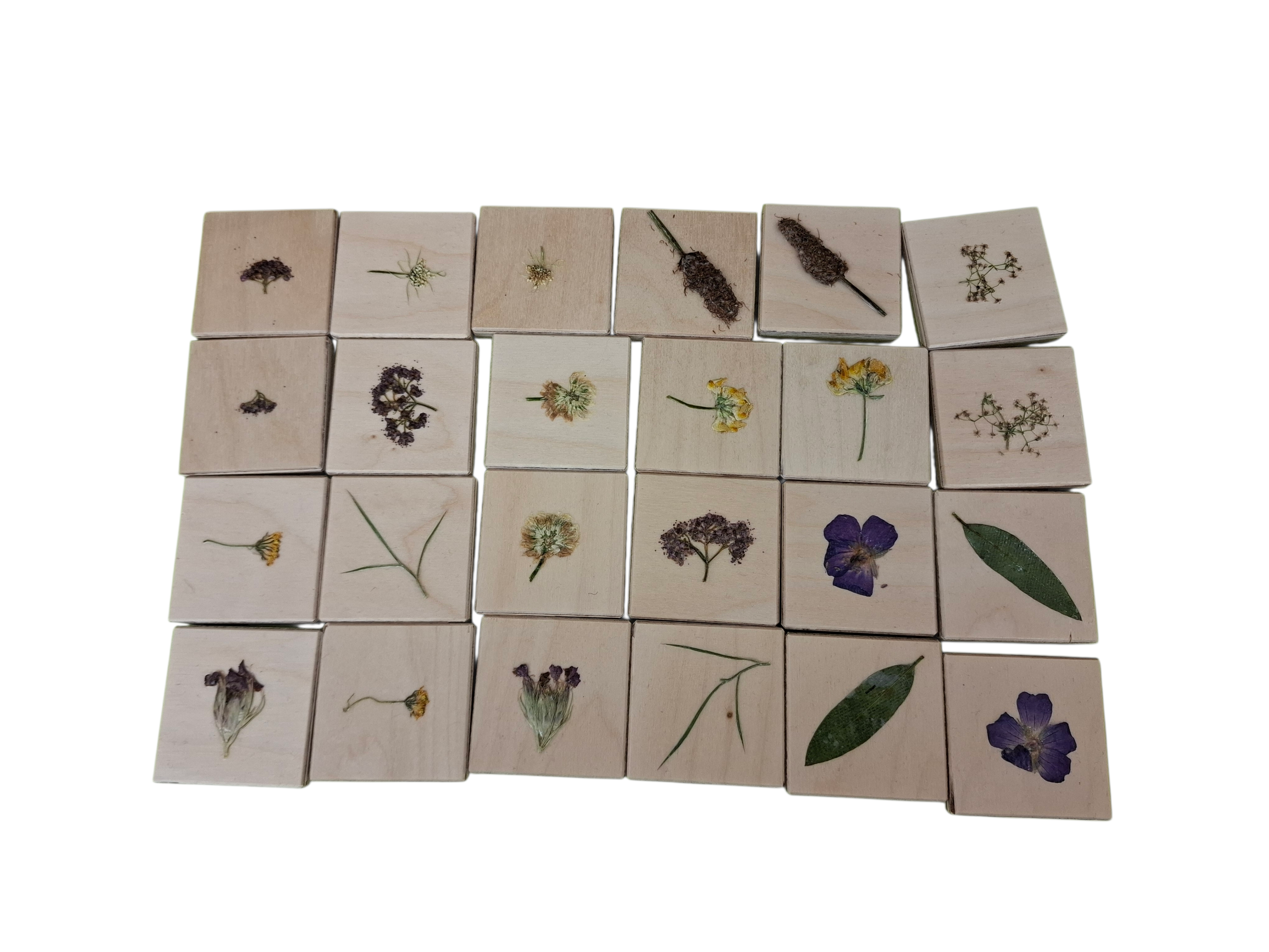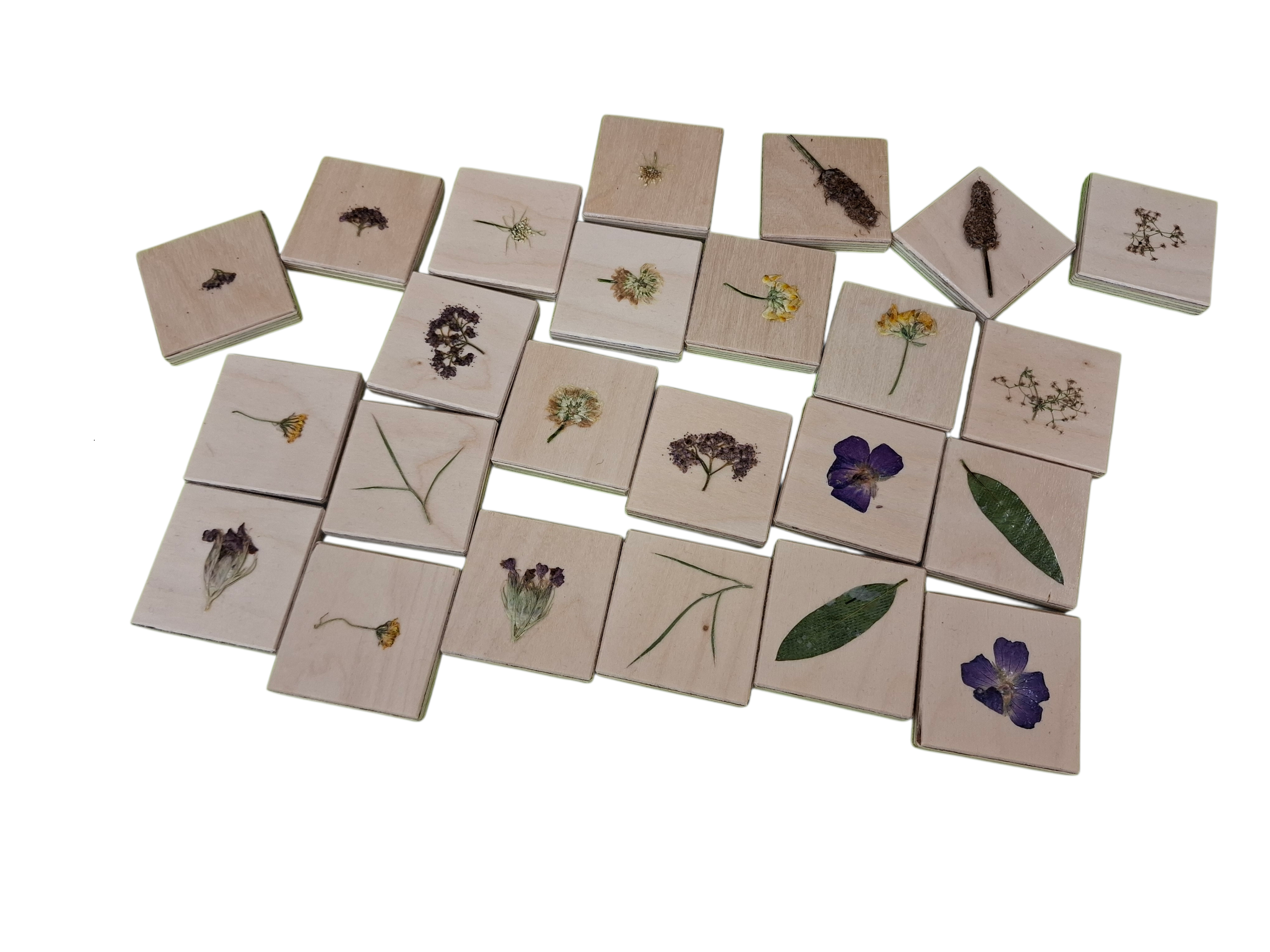 - Memory aus Birkenholz mit 24 handgefertigten Steinen, mit echten gepressten Pflanzen